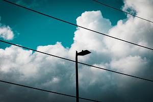 A small bird watches from atop a lightpost. The symetrical wires lock away the sky an the freedom it would bring, but it it still too vast to be locked.
