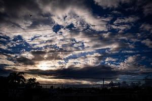 There are little to none more unique experiences than it it to see day turn into night, especially for a little bird trying to fly towards the light. The picture shows the sun engulfed in clouds as it goes down the horizon. The cables showing us that even in the city, there are moments of pure bliss in the skies avobe us.